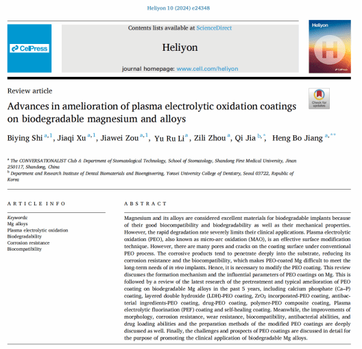 近日,pg娱乐电子游戏官网入口“健谈者”科研社团中的2020级口腔医学专业本科生施碧颖、2021级口腔医学技术专业本科生徐佳琪、2021级口腔医学专业本科生邹家未在pg娱乐电子游戏官网入口姜亨波老师的指导下,以第一作者身份在综合性知名SCI期刊《Heliyon》(影响因子:4.0)上发表科研综述性论文,题目为”Advances in amelioration of plasma electrolytic oxidation coatings on biodegradable magnesium and alloys”