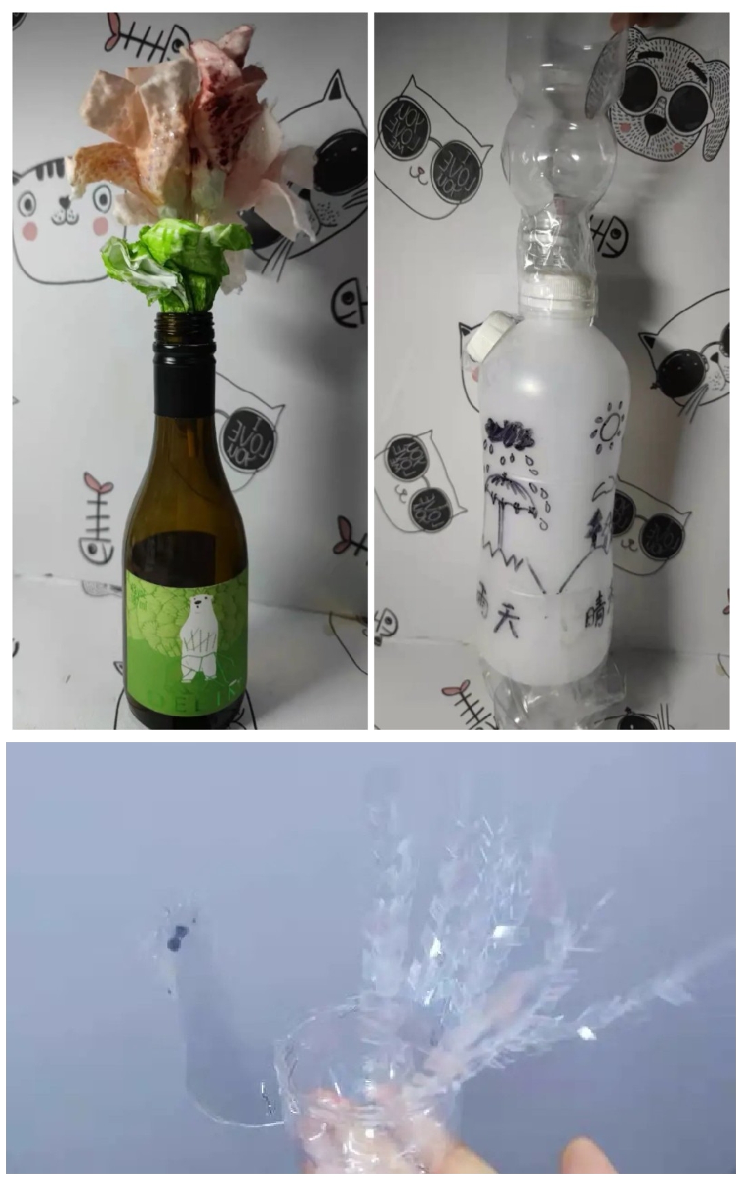 同学们充分发挥创造力和想象力,利用生活中常见的简单素材制作作品,表达出同学们对校园内资源循环、保护环境的倡导与支持。评委通过评比,选出了九个获奖的优秀作品,并为它们的创作者颁发奖状。其中,一等奖获得者为康诗苑、张雯靖和张国立