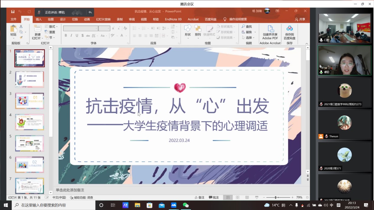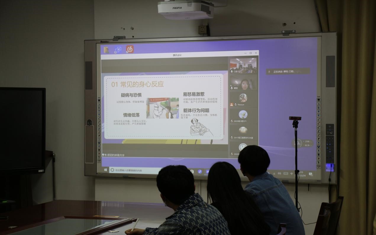 随后,为确保疫情期间同学们的心理健康,辅导员谭玥老师为全体学生进行了“抗击疫情,从心开始”——大学生疫情背景下的心理调适策略主题报告,谭玥老师指出,疫情期间在校大学生往往产生焦虑、担忧、易怒易激惹、情绪低落等身心反应,并分享了情绪调整、保持良好心态的小策略,叮嘱同学们在面临自己解决不了的心理问题时学会向老师、学校心理健康中心求助,希望同学们在遵守疫情防控制度的同时,关爱自己,关注心理健康。