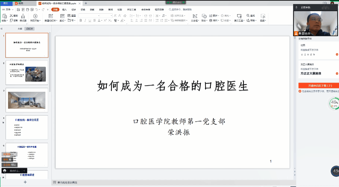 学院教工第一党支部教师与学院2020级3班同学开展领航工程主题学习会,就如何成为一名合格的口腔医生进行讲解和探讨。绝大多数口腔医学本科专业的学生未来的职业是进入各级口腔医疗机构成为一名口腔医生。口腔医学专业培养的最终目的是让口腔医学生实现自己的职业规划和人生规划,成为一名合格的口腔医生。学院荣洪振老师结合工作经历和临床经验,对口腔临床科室和口腔本科阶段课程进行衔接讲解和现状前景分析。从口腔基础医学课程的重要性开始,逐步过渡到口腔相关临床课程,以及口腔各子专业在考研、就业和临床工作的特点逐一分享和分析。口腔医生临床工作的最终目的是服务于患者,会上就如何构建和谐的医患关系,从而更好的服务于患者进行分享和引导。