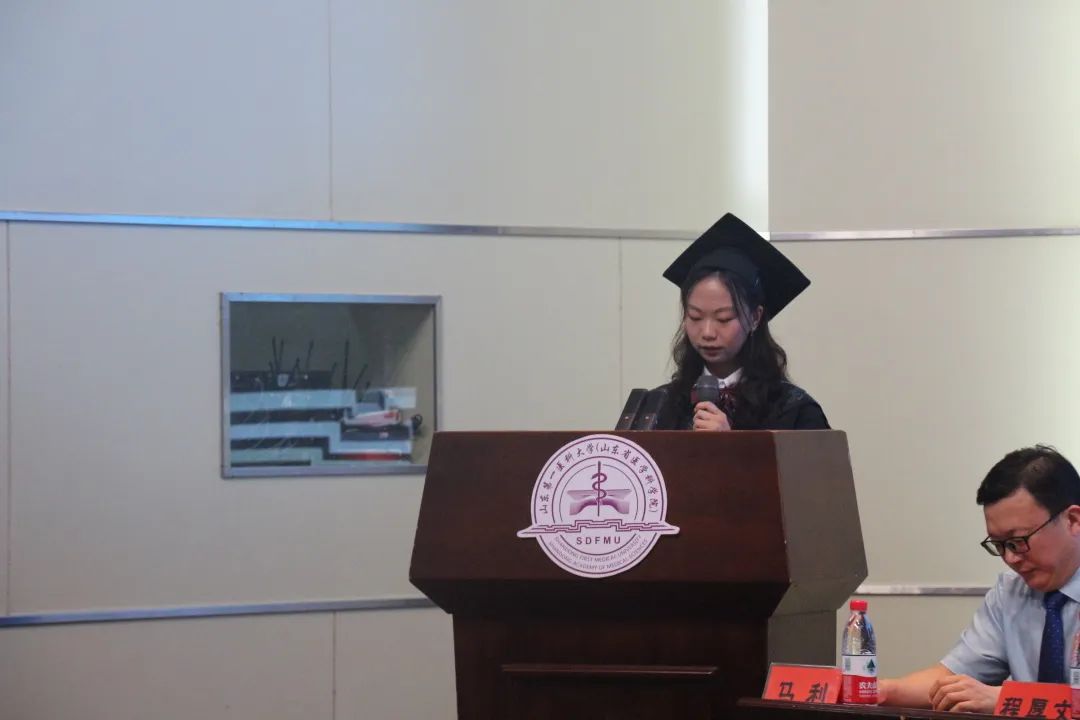 教师代表石运芝老师上台讲话,她对同学们提出三点希望:一要坚定信心,做一名合格的好医生、好技师;二要倾注人文关怀,注重合理有效的医患沟通;三是希望同学们在工作学习中勇于创新,敢于担当,精益求精。接着毕业生代表李知音上台发言,她带领全体毕业生起身向台上领导老师鞠躬表达对学校、老师、同学的衷心感谢,感谢母校的栽培、感谢老师的教诲。并回顾了五年的求学生涯,表示将永远牢记pg娱乐电子游戏官网入口“跬步千里,止于至善”的校训,走好未来的人生路,努力成为母校的骄傲。最后在校生代表、2019级口腔医学本科3班吕海涛同学发言,他代表全体在校生向即将离开母校的学长学姐表达衷心的祝福,同时也表示自己会跟随他们的脚步,向他们看齐,在今后的大学时光中更加努力奋斗、不负韶华、勇往直前。
