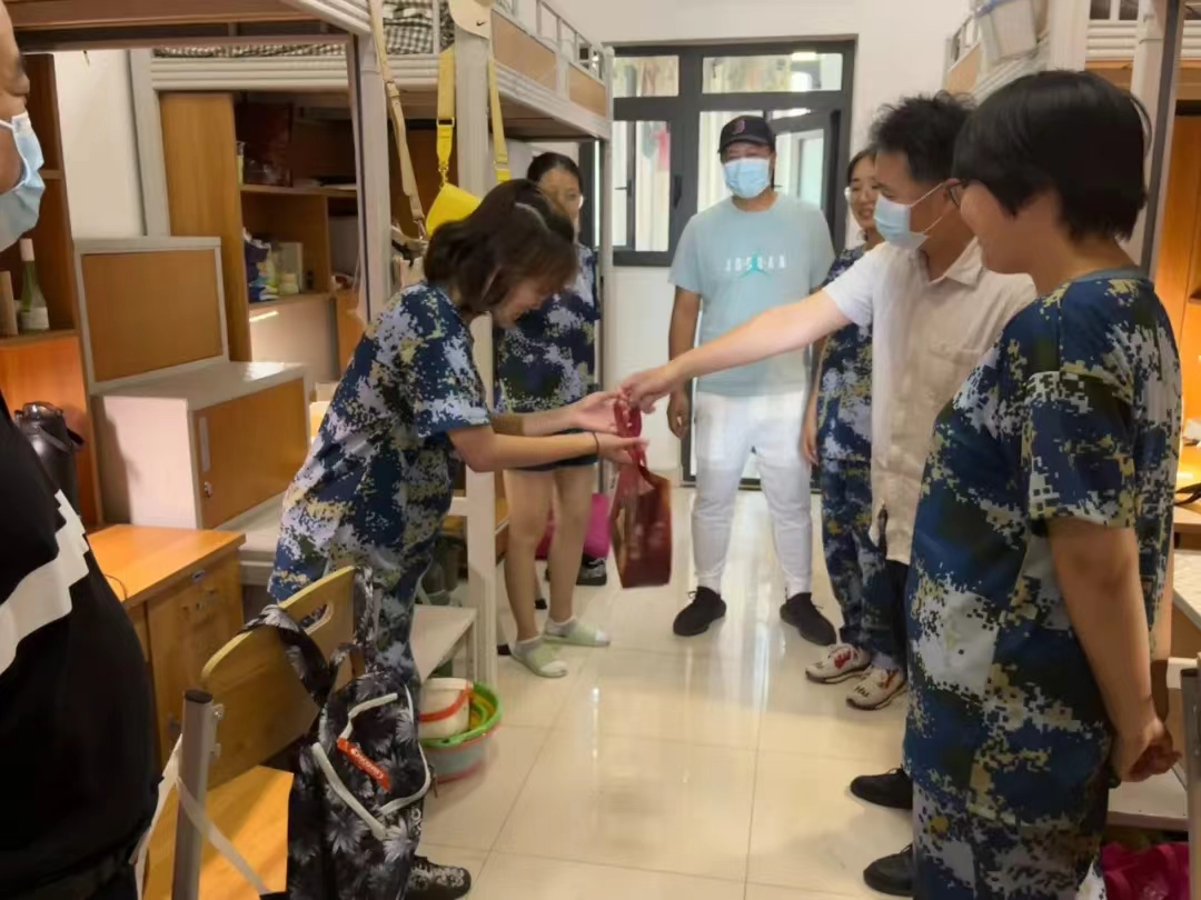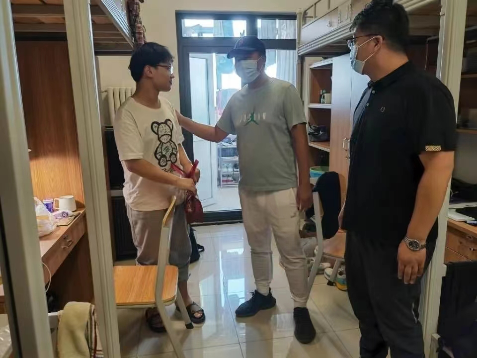 走访中,孔志峰书记与同学们亲切交谈,热切关心大一级新生的军训情况以及大学生活适应情况,鼓励同学们要不怕苦、不怕累,在军训期间认真训练、提高身体素质。孔书记热心询问了大二、大三同学们的学习生活情况,勉励同学们要努力学习、掌握正确学习方法、多去图书馆读书扩展视野,为未来考研、工作做好人生规划。副书记谢建立热心问候同学们的寝室住宿情况,并叮嘱同学们在有序进行学习生活的同时,一定要严格遵守学校的防疫政策,时刻把安全放在第一位。宿舍里洋溢着师生间的浓浓情意,荡漾着节日里的温馨祝福。