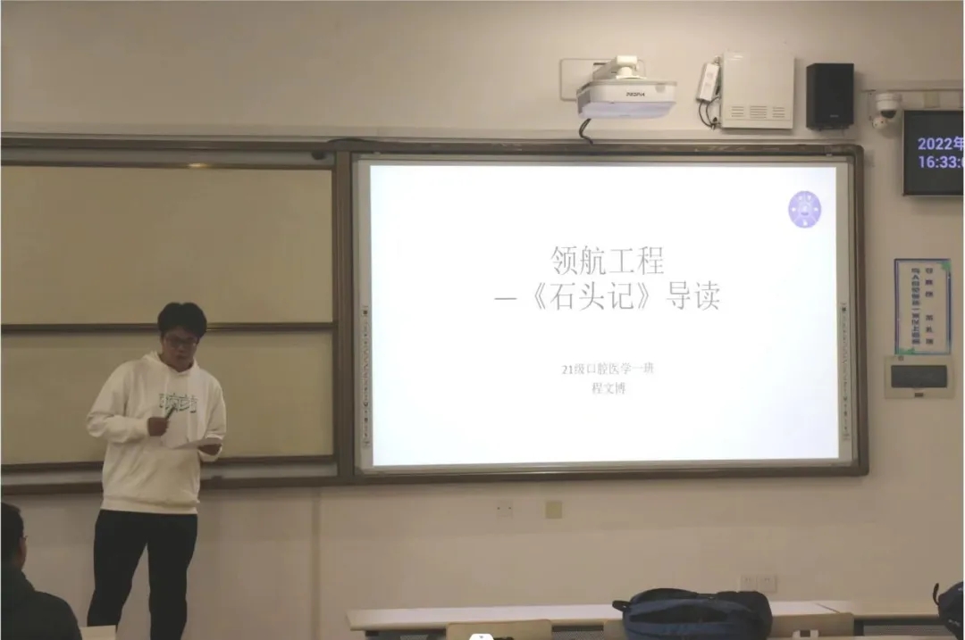 2021级口腔医学1班程文博分享了自己对《石头记》一书的感悟,借同学们熟知的经典文学作品与作文练习进行交流互动,向大家介绍文学与高中语文的区别,表达出自己对于语言局限性的思考,鼓励大家在面对学习生活困难时,积极从文学作品中寻找依靠、积蓄力量,相信人性的光辉。