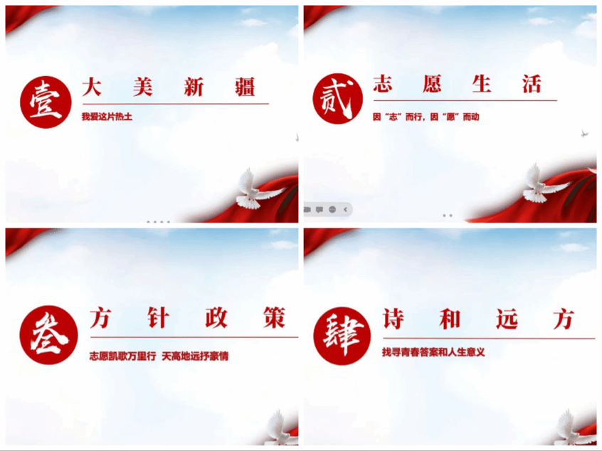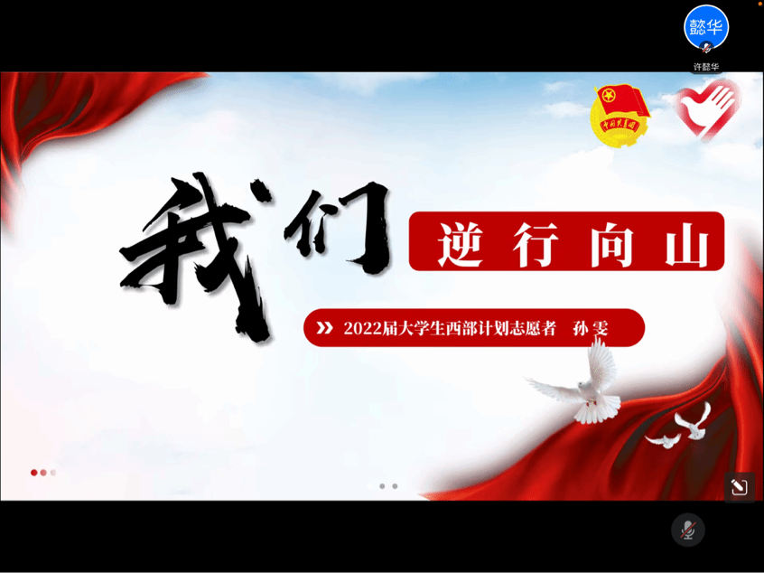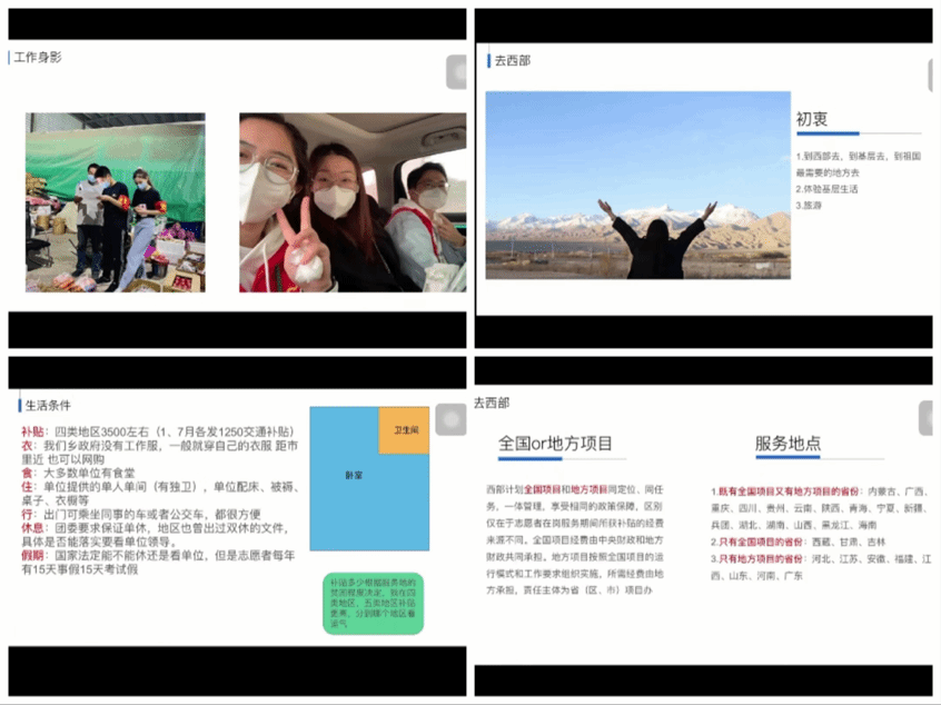 志愿凯歌万里行,天高地远抒豪情。2022届大学生西部计划志愿者孙雯向大家分享了服务地新疆的风土人情以及志愿生活,并就志愿者补贴、职称评定等方面对西部计划相关方针政策进行了详细介绍。最后,她鼓励大家逆行向山,以青春之名,赴西部之约!