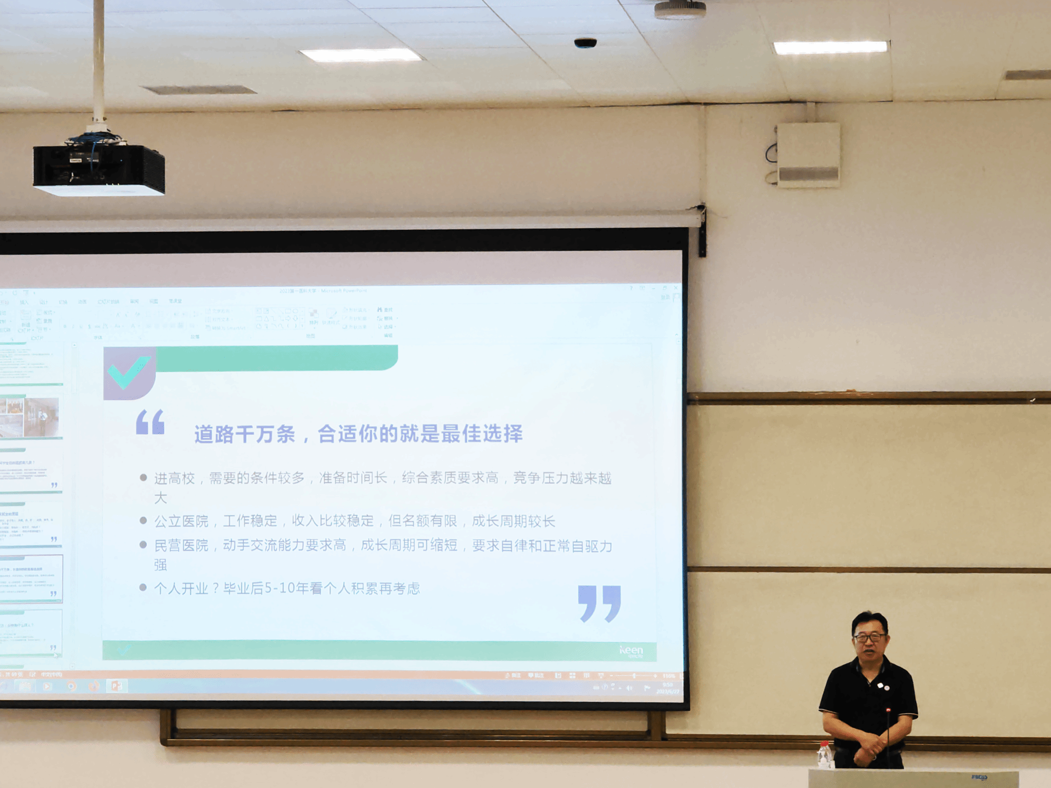 最后,可恩口腔医院总院长亓庆国教授,凭借着自己丰富的专业经验与阅历,围绕口腔专业对人才需求、医生的成长经历及医患沟通等方面进行了系统讲解。正如中国“外科之父”裘法祖院士说的那样:“德不近佛者不可以够为医,才不近仙者不可以够为医。”亓教授语重心长地教导同学们:穿上白大褂并不意味着就成为了医生,医学生的成才之路是一个漫长且艰苦的过程,一日从医,便要坚持在医学领域中奋斗拼搏。