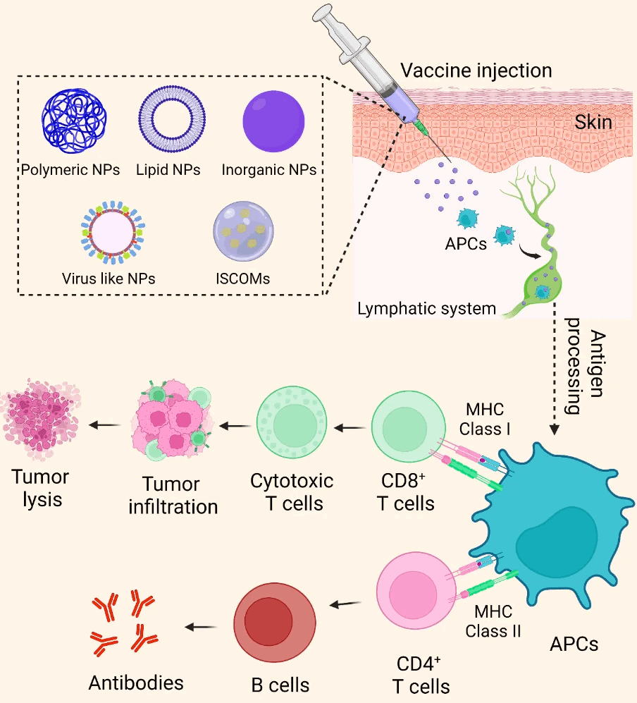 目前,恶性肿瘤是导致全世界患者死亡的主要原因之一,其发病率和死亡率不断攀升,严重危害人类生命健康。免疫疗法的研究与发展致力于为肿瘤治疗寻求新的突破,其中肿瘤疫苗作为一种治疗手段,利用特异性肿瘤抗原或相关抗原激活免疫系统,诱导特异性免疫反应,以达到杀伤肿瘤细胞和预防转移复发的目的。作为肿瘤免疫治疗领域的热点之一,肿瘤疫苗在癌症治疗中具有巨大的潜力。尽管基于疫苗的抗肿瘤疗法理论基础优越,但目前临床治疗效果仍不尽人意。在癌症患者中引起强大的免疫反应仍然是一个重大挑战,主要是因为癌症疫苗的免疫原性低下,肿瘤微环境的免疫抑制以及癌症疫苗抗原与患者肿瘤的相关性。在这篇文章中,张东升教授团队首先总结了癌症疫苗的免疫学机制,然后重点介绍了各种类型的纳米疫苗(聚合物纳米疫苗、脂质体、无机纳米疫苗、类病毒颗粒和免疫刺激复合物)的优缺点,以及在癌症免疫治疗领域的最新进展。此外,本研究还深入探讨了将纳米技术与其他类型疗法(例如嵌合抗原受体T细胞免疫疗法和光热/免疫联合治疗)相结合所面临的挑战和前景。通过分析与纳米疫苗相关的挑战和机遇,团队旨在启发未来的癌症免疫疗法充分利用纳米技术的潜力,提供更有效、更精准的治疗手段。