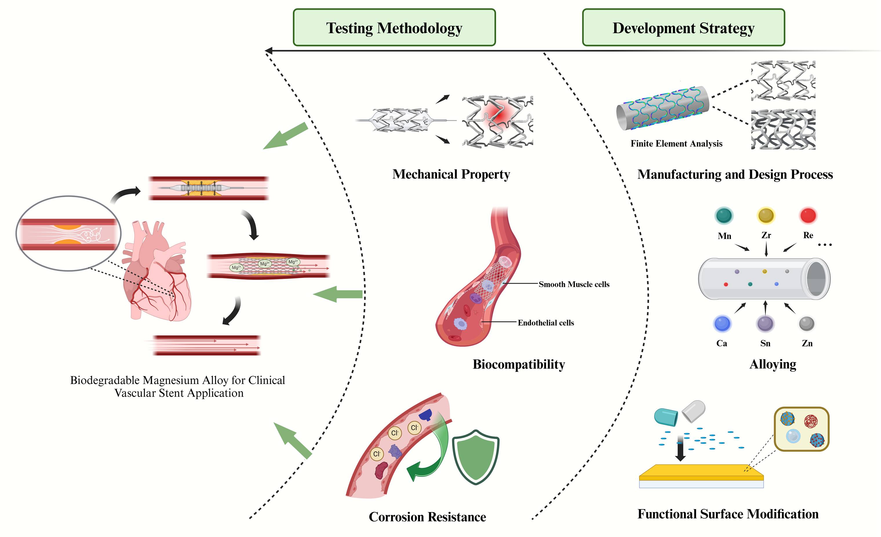 心血管疾病(CVD)仍是全球主要的致死原因之一,迫切需要创新性的治疗解决方案。可降解镁基心血管支架(BMgS)作为治疗冠状动脉疾病的突破性替代方案,应运而生。它们通过提供暂时性的血管支撑,并在体内安全降解,有效减少了永久性植入物所带来的并发症。过去十年间,BMgS的研究取得了显著进展。然而,诸如降解速率难以控制、机械强度不足以及生物相容性有限等问题,仍然制约其临床转化。本研究聚焦于镁基可降解心血管支架这一前沿热点,系统梳理了在过去十年的研究进展,聚焦于体外测试方法与开发策略,具有很强的前瞻性与学术价值。论文不仅识别了当前仍待解决的关键挑战,还提出了切实可行的应对策略,为相关领域研究者与产业界提供了重要参考,助力下一代BMgS的开发,推动心血管治疗模式的革新,最终改善患者预后。文章不仅从方法学、材料科学、制造工艺、结构设计及表面功能化等方面进行了全景式回顾,更突出了体外评价方法在材料研发与临床转化之间的桥梁作用,这是该研究的一大亮点与创新。