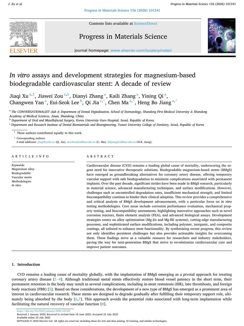 2025年7月23日,口腔科技社团(健谈者俱乐部)成员们在顶级学术期刊Progress in Materials Science(影响因子40分)上发表论文《In vitro assays and development strategies for magnesium-based biodegradable cardiovascular stent: A decade of review》(https://doi.org/10.1016/j.pmatsci.2025.101541)。
