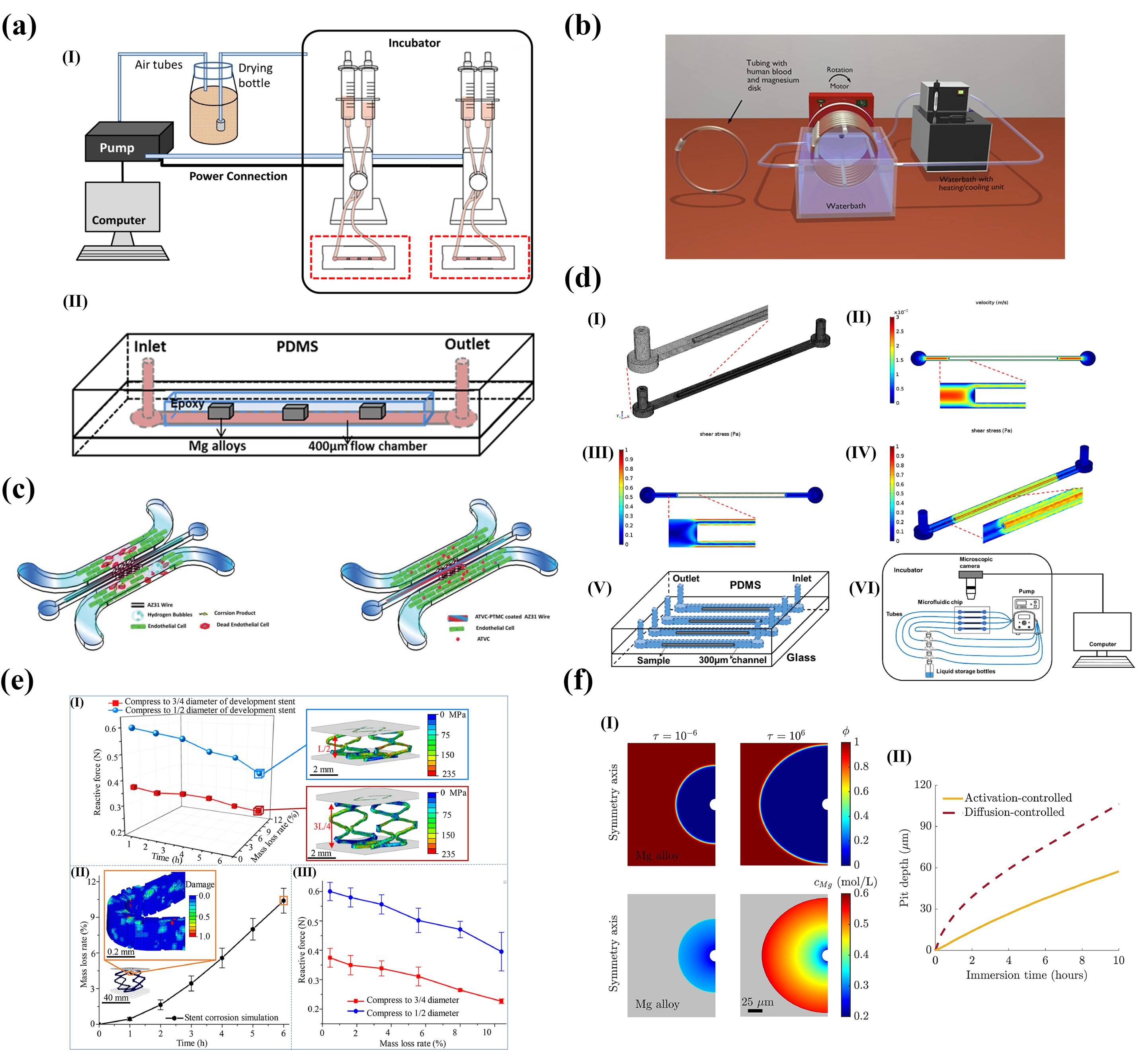 该论文提出了一个完整的体外评价方法体系,包括:腐蚀性能测试(Corrosion performance testing):深入分析了镁合金在类生理环境中的降解规律,强调了机械载荷、流体剪切力及腐蚀介质等关键因素的作用。特别是对新型腐蚀反应器与多维评价方法的综述,为未来测试标准的建立提供了参考。力学性能测试(Mechanical performance testing):系统总结了拉伸、弯曲、压缩、硬度及疲劳等通用方法,同时引入虚拟力学测试,体现了实验与计算模拟(如有限元分析 FEA)的有机结合。生物相容性测试(Biocompatibility testing):围绕血液相容性、细胞相容性及免疫反应,全面涵盖血小板黏附、溶血、凝血时间、内皮细胞、平滑肌细胞与巨噬细胞反应等核心指标,展现了多维度的生物评估体系。这种从腐蚀—力学—生物相容性的三位一体评价模式,显著提升了BMgS研究的系统性和临床转化相关性。