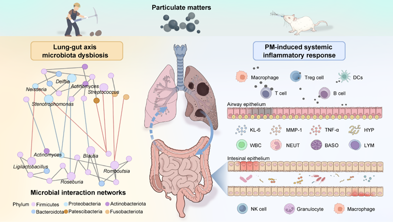 流行病学与毒理学研究证实,外源性颗粒物浓度升高不仅与呼吸道菌群变化存在密切关联,还同时影响肠道菌群,而改变后的肠道菌群又能反向调控全身免疫。颗粒物暴露诱导的呼吸道和肠道多生态位微生物组失调以及“肺-肠”轴改变可能是疾病发生发展的关键原因之一,这为尘肺的发病机制提供了新的理解路径和研究方向。