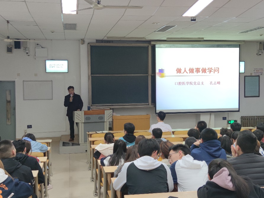 随后,学院党总支书记孔志峰为大家上了一堂生动的“人生之课”。他强调,要学会做人,做一个诚实、正直、谦虚、本分、胸襟开阔的人,修德明理、锤炼品格,做一个有态度的大学生。要学会做事,要不忘初心,找准定位,尽早树立明确的目标和坚定的信念,热爱生活、躬行实干,做一个有温度的大学生。要学会做学问,充分利用大学时光,沉潜下来,自我完善,勤于学习、厚积薄发,做一个有深度的大学生。心怀理想,仰望天空、志存高远,做一个有高度的大学生。执着追求“悬壶济世”的“大医梦”,努力成长为能担当起中华民族新的百年伟业的栋梁之才!