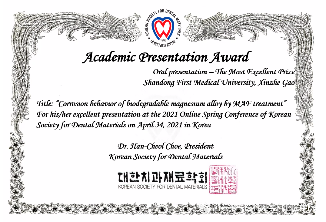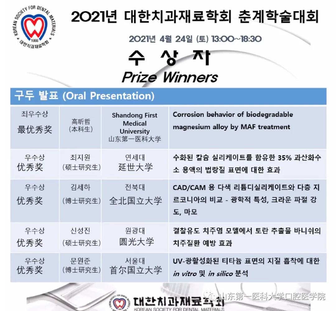 为提高学生的专业能力和综合素养,同时锻炼英语口语与国际交流能力,4月24日pg娱乐电子游戏官网pg娱乐电子游戏官网入口多名同学参加了韩国口腔材料学学术交流会议,高昕哲、孙仕勋和贾琦同学及他们所在的团队在学术交流会议上分享了该小组的学术成果。与会人员有pg娱乐电子游戏官网入口、延世大学、全北国立大学、圆光大学、首尔国立大学等高校成员,其中高昕哲同学及她的团队凭借前沿的课题和出色的表达能力在一众参与者中荣获演讲最优奖。