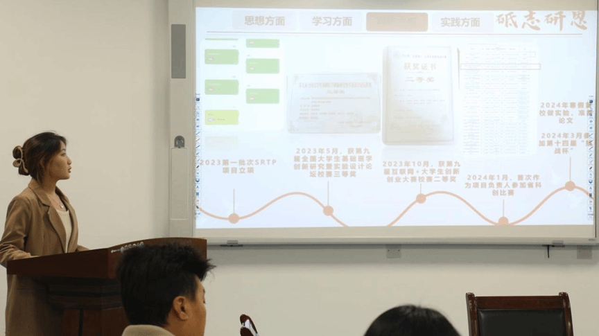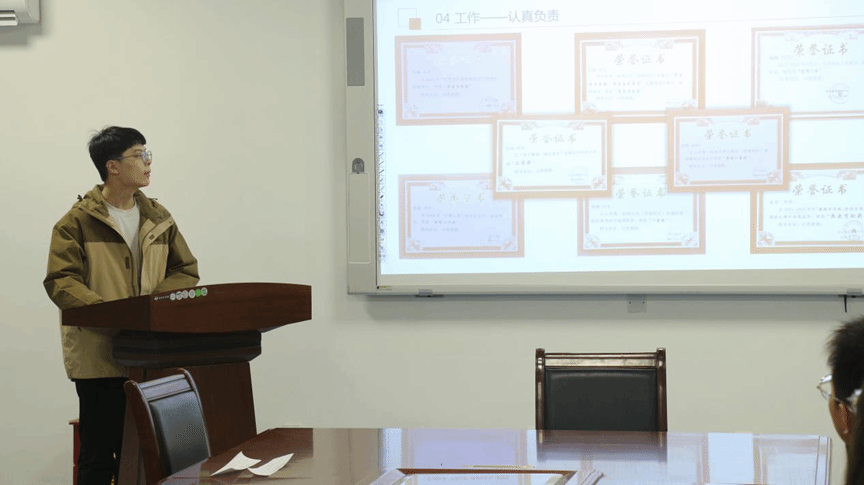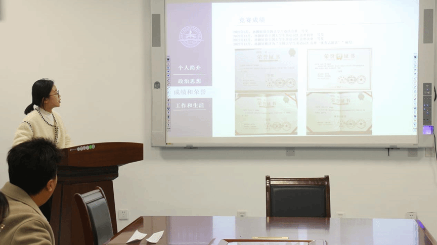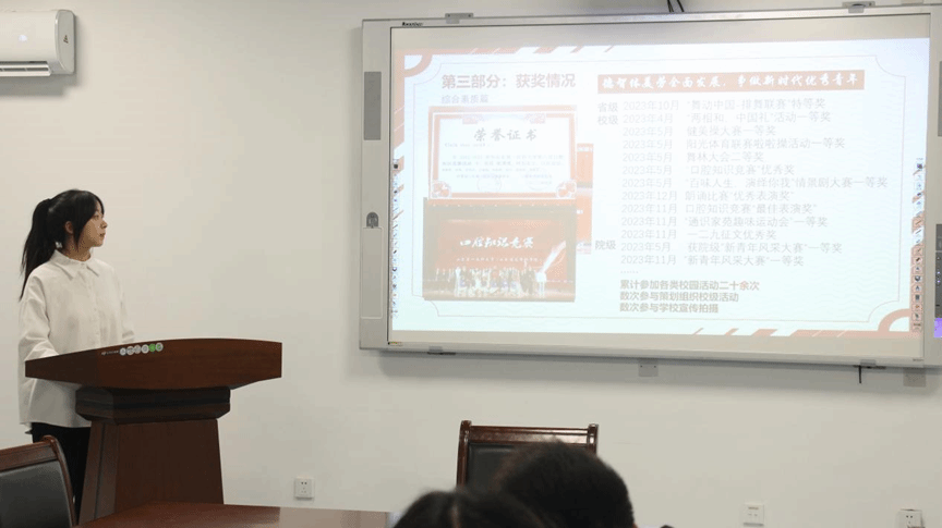 经过前期个人申报、班级评议以及学院审核,张顺、张凯莉、孙颢展、齐怡宁4位同学入围了本次的答辩环节。他们以PPT汇报的形式进行个人展示,从政治思想、成绩荣誉、工作生活、科研成就等方面进行了自我陈述,向老师们讲述了自己在大学期间获得的各项成就,展现了昂扬向上、锐意进取、自信饱满的精神风貌。本次评议会对于优秀学生、优秀学生干部的评选起到了积极引导的作用,有效激励大学生勤奋学习、努力进取,为学院优良学风的建设奠定了坚实的基础。