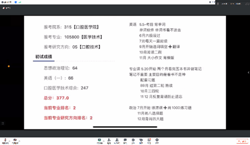 为助力2025届考研学子,明确考研目标,掌握考研技巧,了解更多考研信息,圆梦研究生殿堂,推进一站式学生社区建设。2024年5月29日下午,pg娱乐电子游戏官网入口举办口腔医学技术考研经验分享线上会议,2020级口腔医学技术一班段婷婷、何冰同学进行经验分享。此次线上会议吸引了各级口腔医学技术专业的同学们积极参与,共同探讨和交流考研的策略和方法。