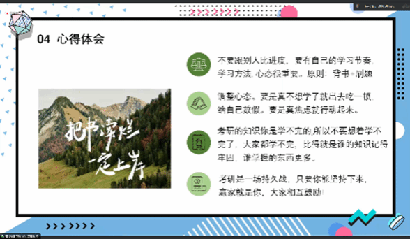 段婷婷同学首先进行分享,讲解了五步定院校这一选择院校的方法,随后进行了备考经验的分享,从考研重要时间点、英语、专业课这几个方面分享自己的心得体会与经验。最后,讲述了备考的心得体会:按部就班进行备考,坚定选择一条路一个选择,考研是一场持久战,只要能够坚持下来,就能成为赢家!