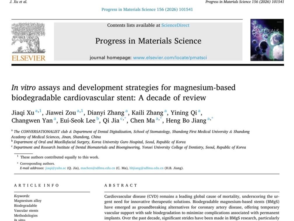 2025年7月23日,口腔科技社团(健谈者俱乐部)成员们在顶级学术期刊Progress in Materials Science(影响因子40分)上发表论文《In vitro assays and development strategies for magnesium-based biodegradable cardiovascular stent: A decade of review》(https://doi.org/10.1016/j.pmatsci.2025.101541)。历时数月反复打磨,从文献查阅、框架搭建,到内容撰写、语言校对,每一字每一句都凝聚了团队日日夜夜的心血与坚持。该...
