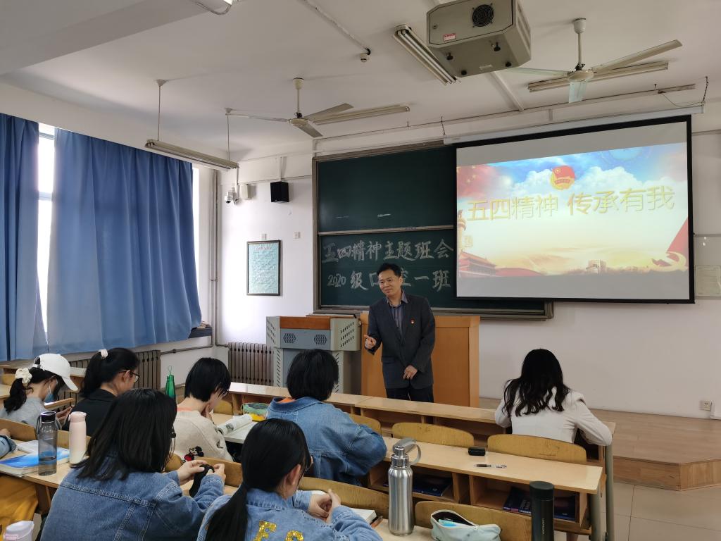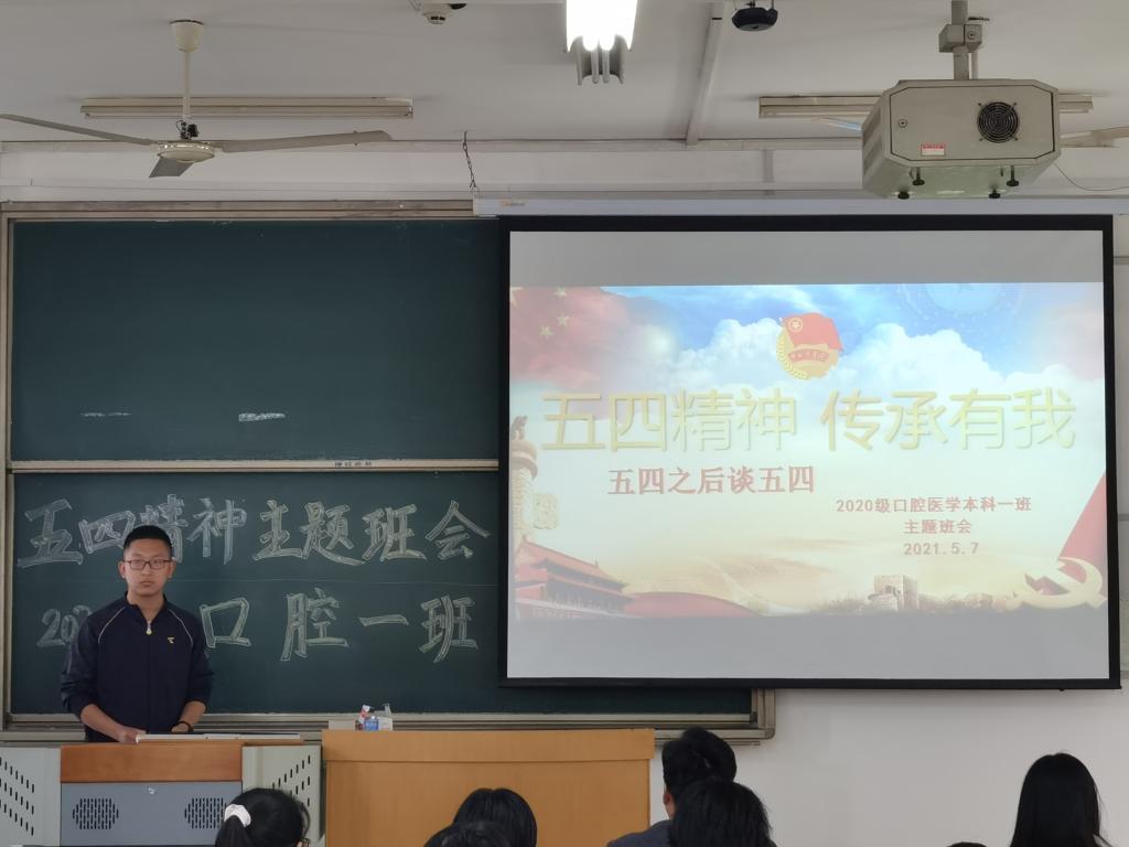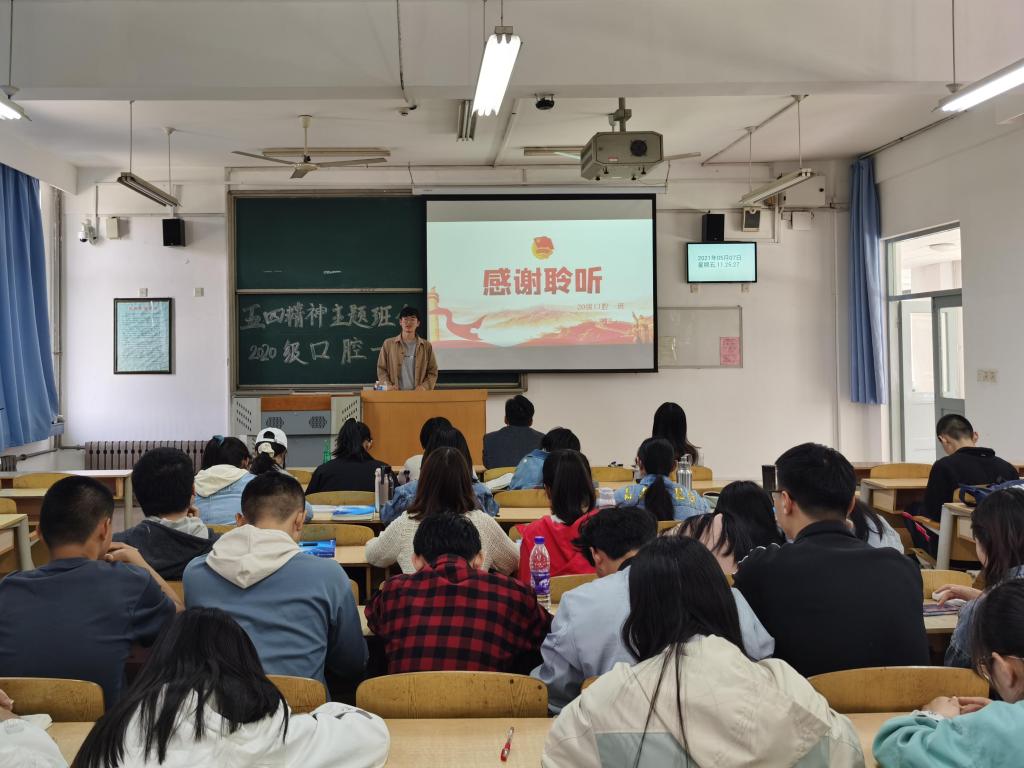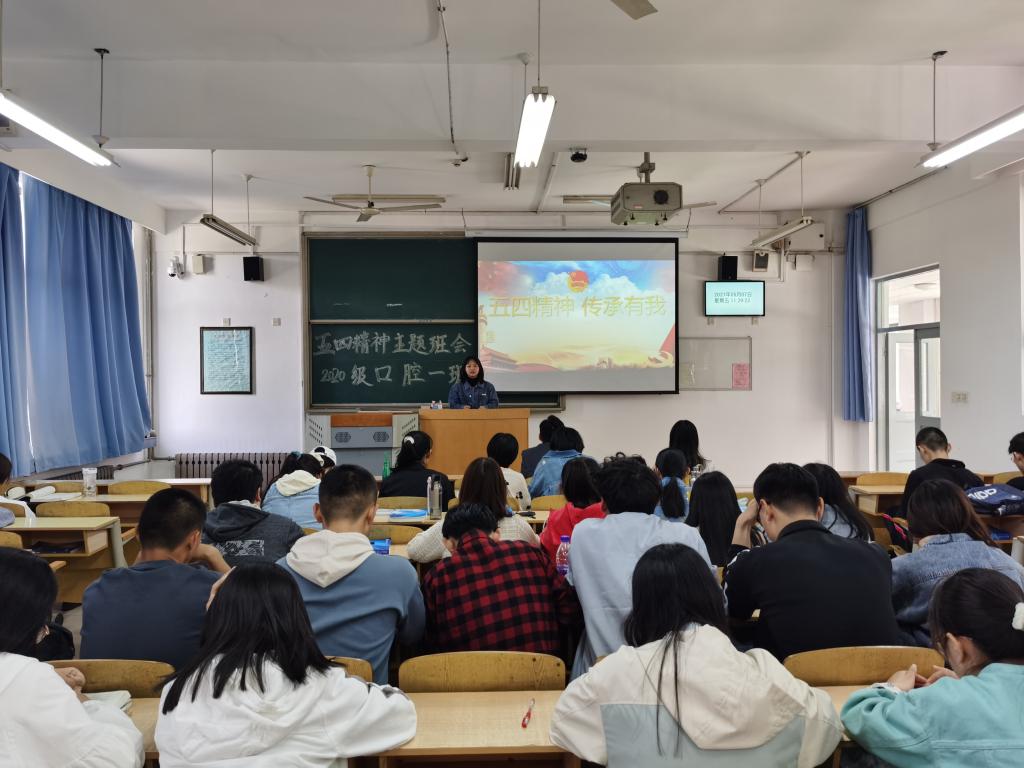 为传承五四精神,强化责任担当,坚定新时代青年立大志、明大德、成大才、担大任的前进信心,5月7日上午,pg娱乐电子游戏官网入口党总支书记、党政领导干部孔志峰,联系20级口腔一班,在教学南楼C1016教室召开“五四精神,传承有我”的主题班会。辅导员王玉姣、20级一班全体成员参会。